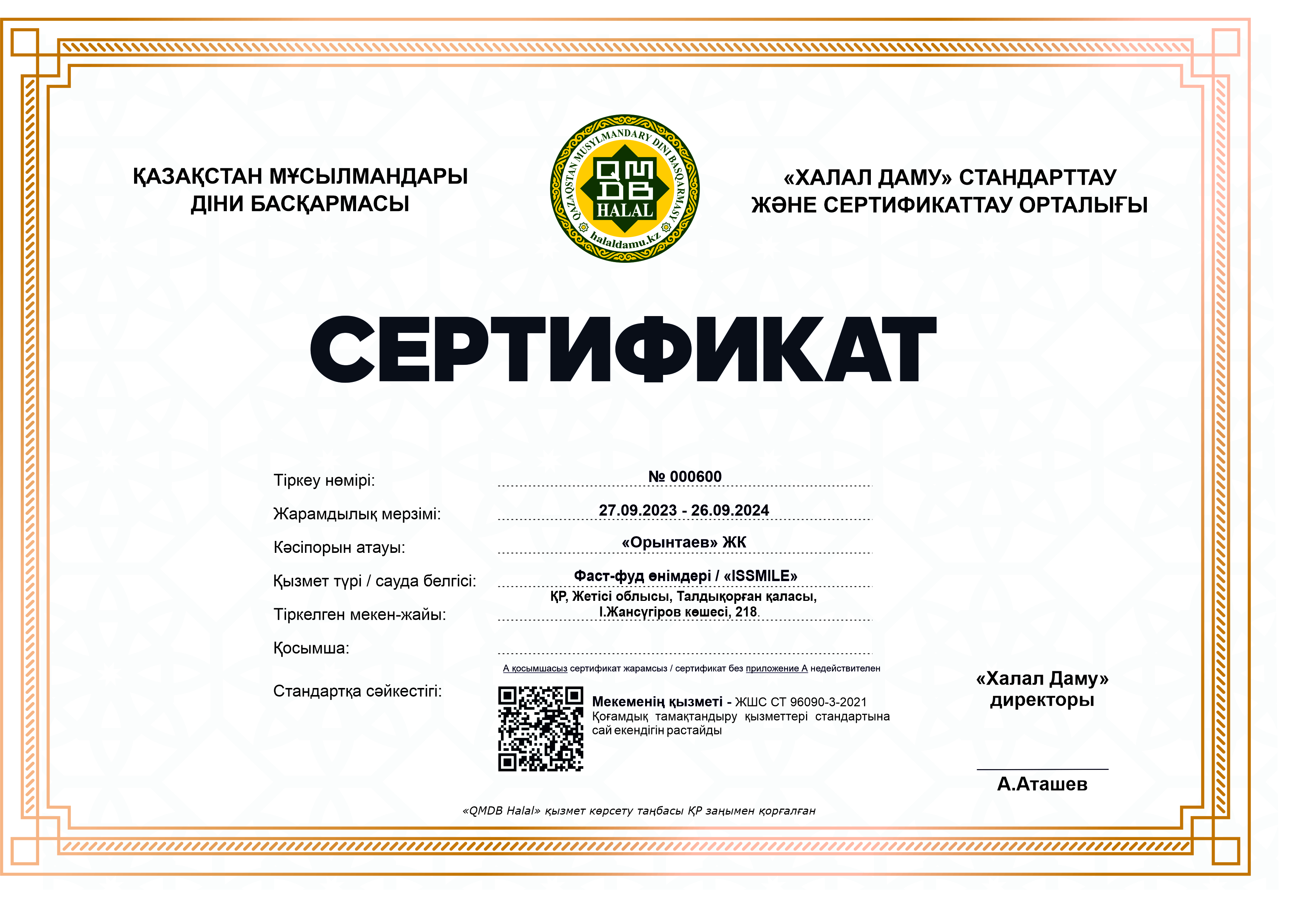 Сертфикат действителен до 26 Сентябрь 2024 ж.